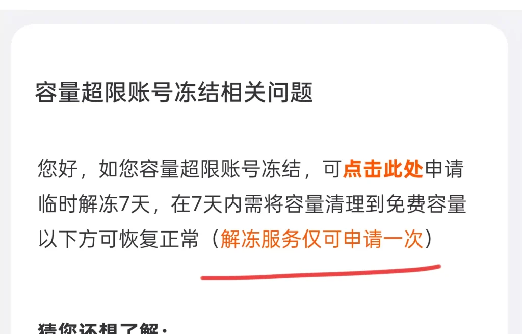 点进“容量超限账号冻结问题”后,里面会有一些官方的解释说明。仔细阅读一下,然后在页面中找到类似于“申请临时解封”或“临时恢复服务”的入口链接或按钮。